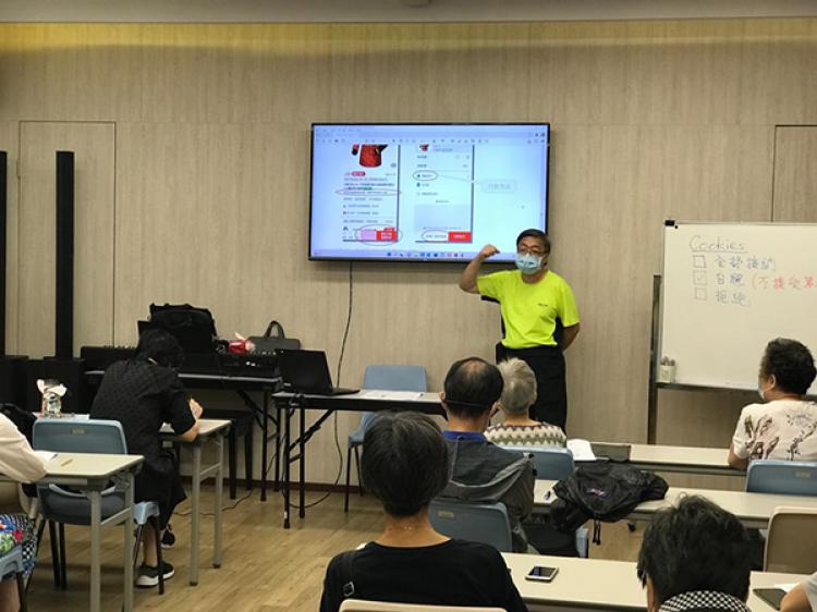 愛秩序灣官立小學香港婦女基金會耆康中心長者學苑於2022年9月9日舉辦實體「網上購物好輕鬆」數碼進階培訓班,長者學員正學習如何在常見的網購平台使用電子錢包進行付款。